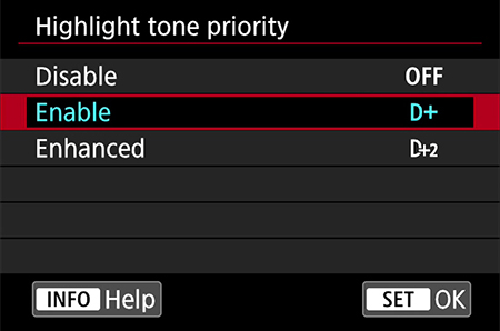 Highlight Tone Priority با گسترش جزئی دینامیک رنج نواحی روشن، جزئیات هایلایت را حفظ میکند و روی فایل RAW و JPEG اعمال میشود، بر خلاف Auto Lighting Optimizer که تنها روی JPEG تاثیر دارد.