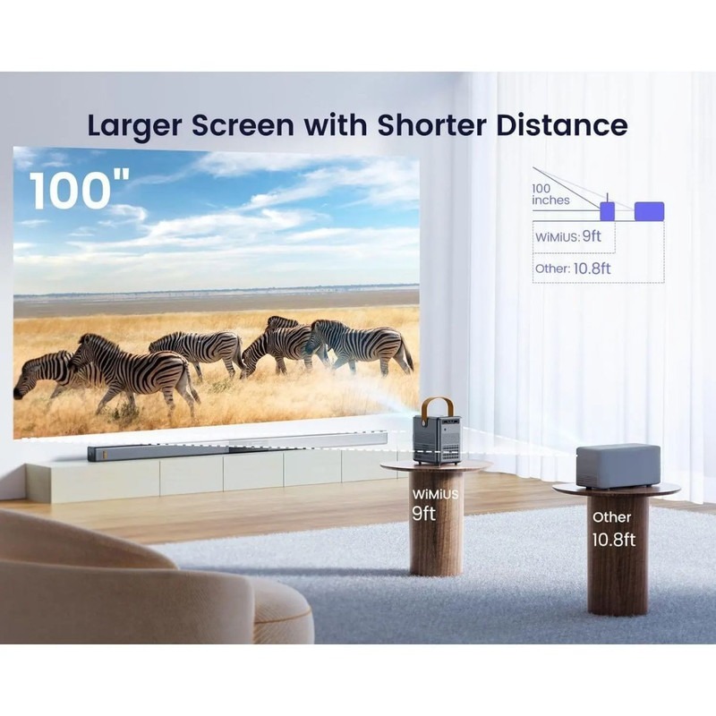 یکی از مزیتهای مهم WiMiUS P61، نمایش تصویری تا ۳۰۰ اینچ است که با توجه به اندازه دستگاه، واقعاً چشمگیر است. این امکان باعث میشود حتی در فضاهای باز یا سالنهای متوسط، یک تصویر بزرگ و سینمایی داشته باشی.