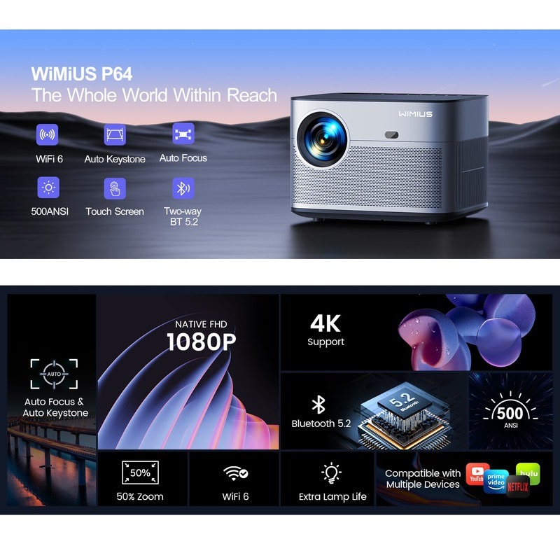 WiMiUS Home Projector P64 از میزان روشنایی مناسب برای استفاده خانگی برخوردار است و میتواند در محیطهای کمنور و نیمهتاریک، تصویری واضح و قابلقبول ارائه دهد. این پروژکتور توانایی نمایش تصویر در ابعاد بسیار بزرگ، تا حدود ۳۰۰ اینچ را دارد که آن را به گزینهای ایدهآل برای تماشای فیلم، سریال، مسابقات ورزشی و حتی بازیهای ویدیویی تبدیل میکند.